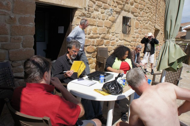 That is Regina from Oakland to my left, and one of the Brits shirtless in front of me. I am looking through his pilgrim passport for his name to register him and to stamp his passport with our unique albergue stamp. He will need that when he gets to Santiago to prove that he has indeed walked the camino.