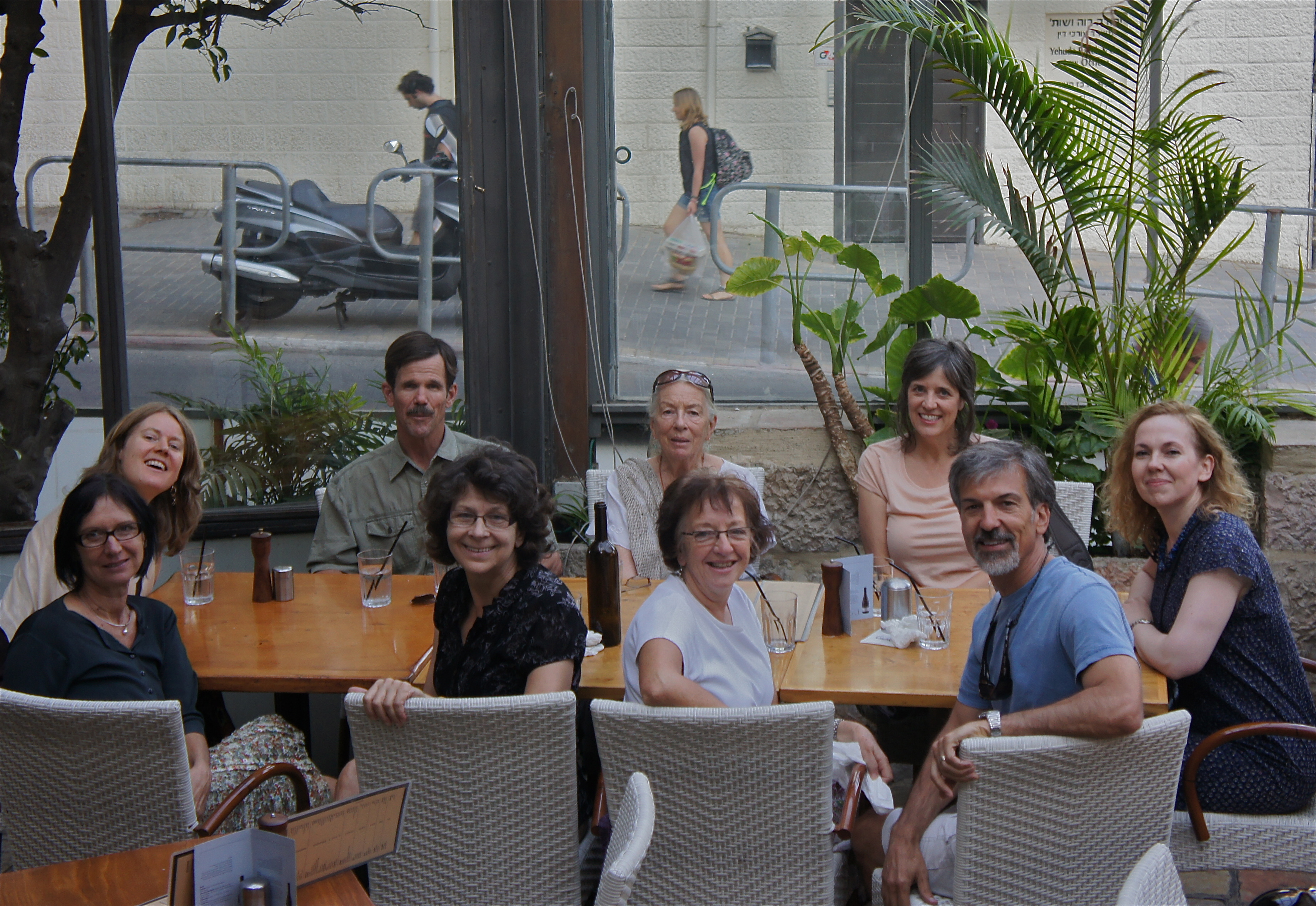 Greetings from the COD, this is a quick post to say that we are well, thriving, learning so much, meeting some great and interesting people along the way of this pilgrimage that continues from one day to the next.  This is a photo taken recently of our team members plus some friends.  The redhead Marian (next to me in glasses) was leaving the next day to return to Australia, so we were out to dinner to send her off properly.  John and Una are our leaders who have been here for many years.  Blonde Bryony on the far left is the newest member.  Bryony is from England and moved in to the house Julee and I live in about a week ago. She fits in perfectly, we are glad she is here.  The small house is now empty with Marian gone, so there is a place for you now!!!