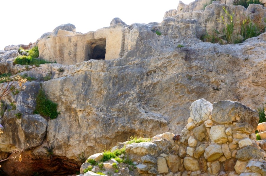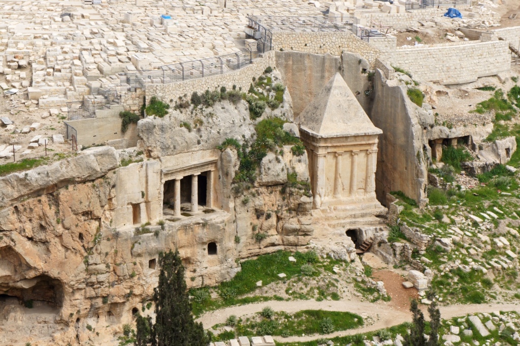 There are other, more popular “Christianized” sites that claim to be David’s tomb here in Jerusalem, but this is the only obvious spot here in the little City of David that would seem likely to fit with scripture. Below are more tombs, from the nearby bottom of the Mount of Olives. Rock cut tombs such as the ones at the bottom of the photo were for the rich only. Jesus was buried in such a tomb; not because he was rich, but because a rich man named Joseph of Arimathea buried Jesus in his own family’s tomb.